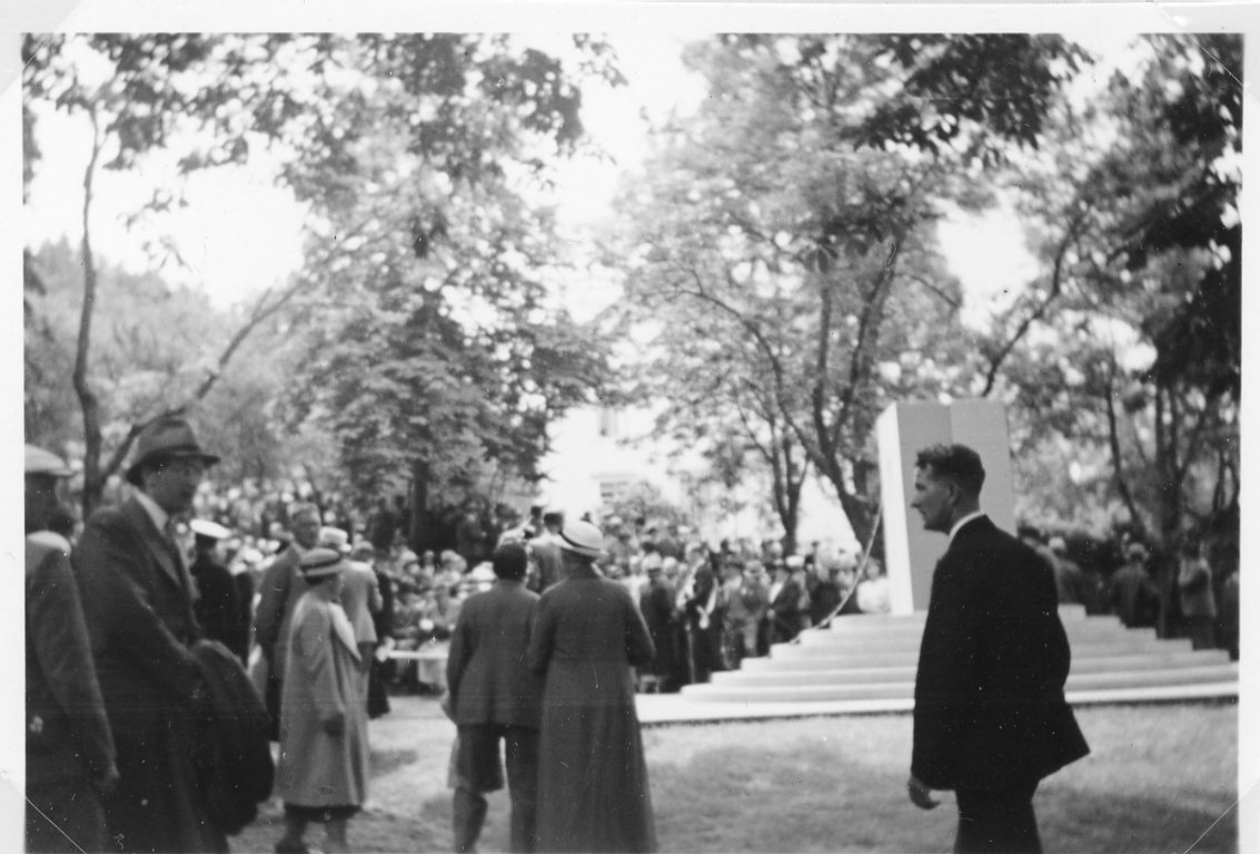 En folksamling runt Tempelriddaremonumentet i Södra parken, Gränna, strax före avtäckning.