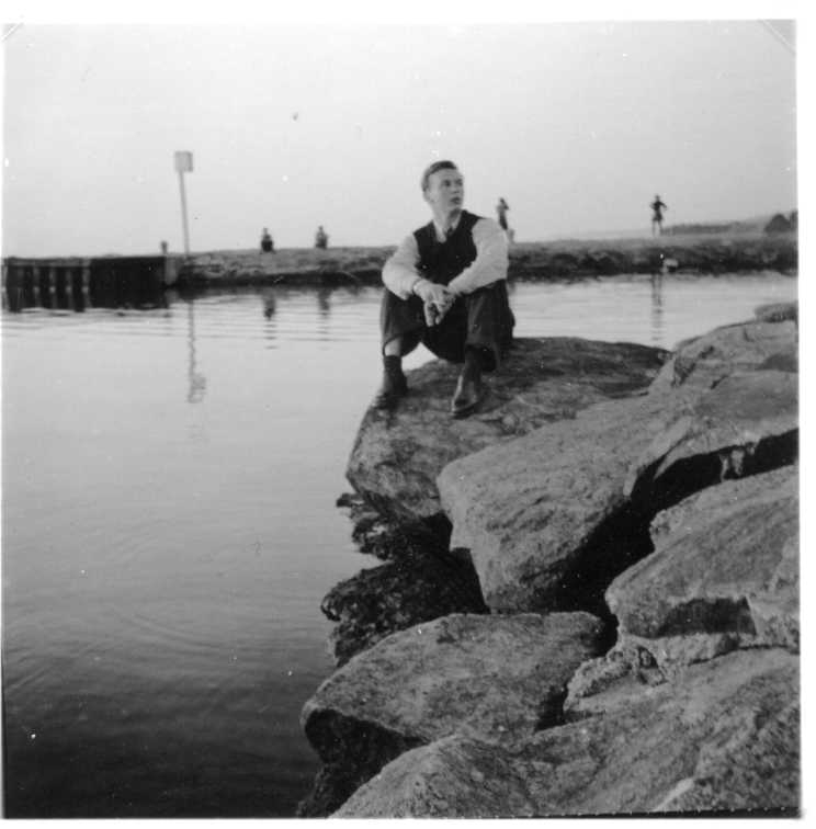 En man ljus skjorta, mörk väst och mörka byxor sitter på en sten möjligen vid Gränna hamn.