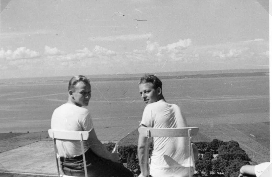 Två unga män i t-shirt på Grännaberget med vy mot kyrkogården. De sitter på trädgårdstolar, vänder sig om och tittar på fotografen.