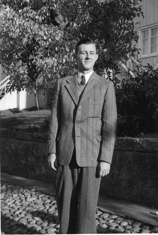 Porträtt av ung man i blazer och slips. Han står på gatan nedanför okänd byggnad och kisar mot solen.