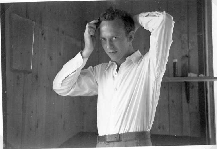 Porträtt av ung man i vit skjorta som kammar håret. Han står i samma rum som bild gm.b4997.