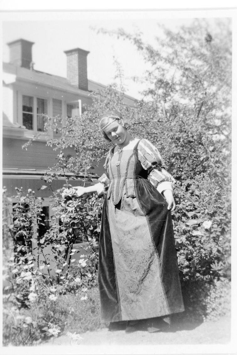 En ung kvinna står i en 1600-talsklänning vid en rosenbuske.