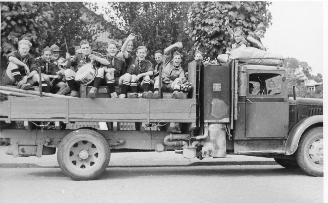 En grupp glada och vinkande unga scouter sitter på ett lastbilsflak. En spelar på en virveltrumma.