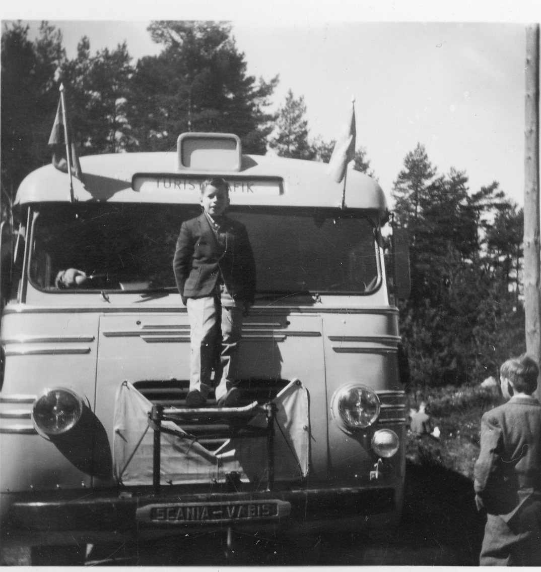 En Scania-Vabis buss med flaggor vid taket och skyltad "Turisttrafik". En pojke står på en båge vid kylaren. En annan pojke till höger framför bussen.