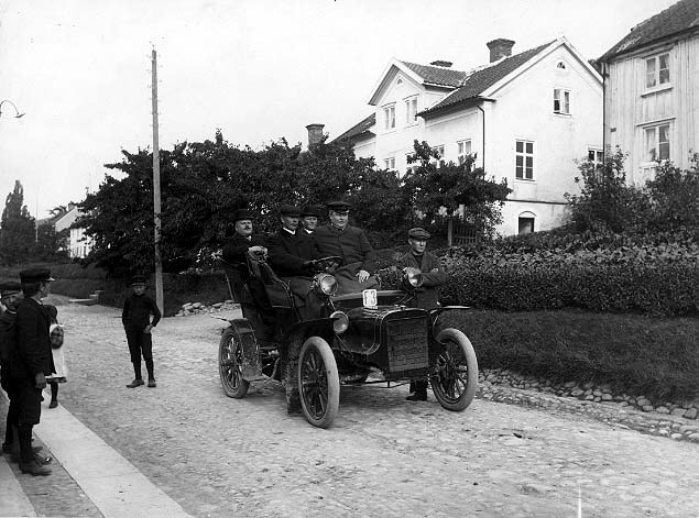 En bil med registreringsskylt "F3" står på den kullerstensbelagda Brahegatan i Gränna. I bilden sitter två män fram och två män där bak. Vid ratten sitter ingenjör Sixtus Pettersson från Jönköping. En ung man med keps står till höger om bilen med armarna i kors. På trottoraren till vänster står barn och tittar på.