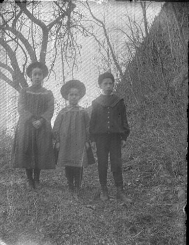 Två små flickor och en pojke står bredvid varandra i en trädgård.