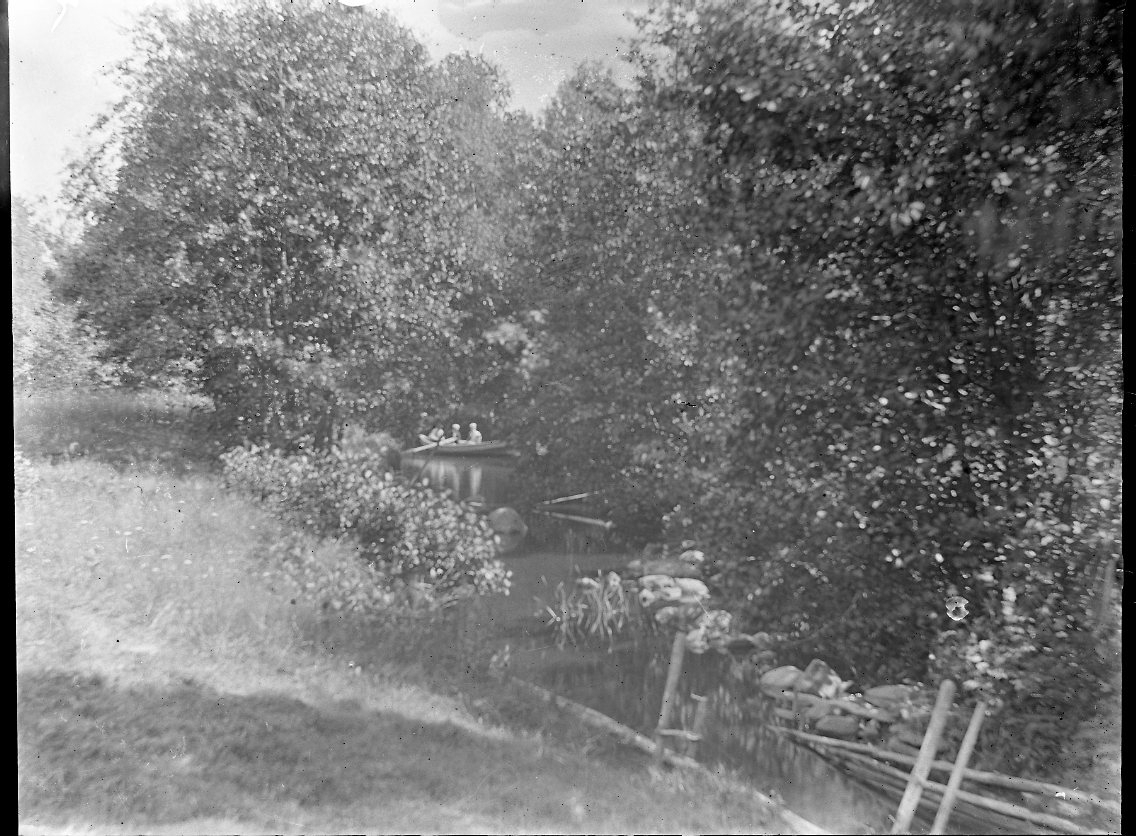 I ett vattendrag mellan höga lövträd anas tre personer i en roddbåt.