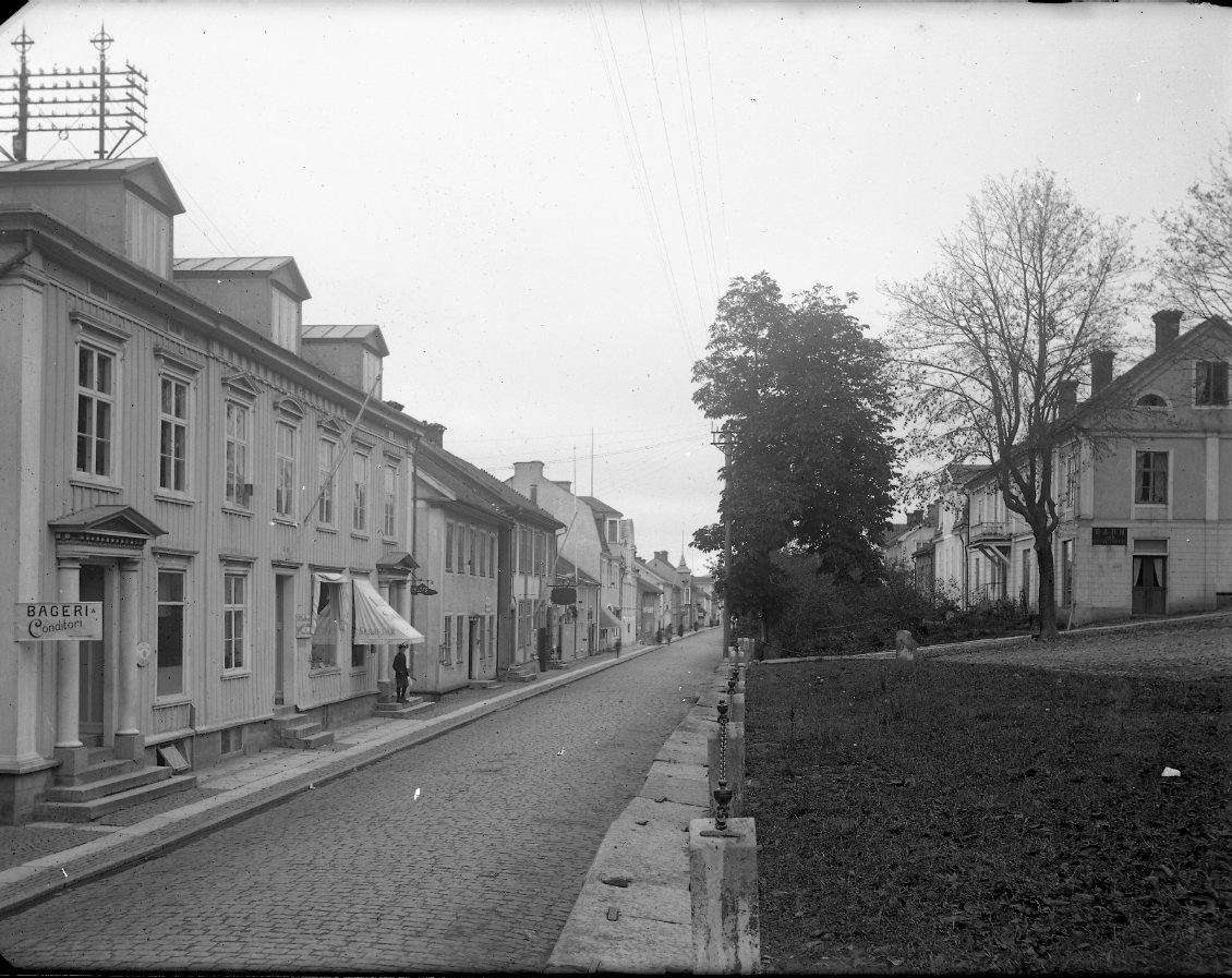 Brahegatan i Gränna, vid torget, norrut. En husrad till vänster med skyltning för bland annat "Bageri & Conditori" samt Eklöfs skor.