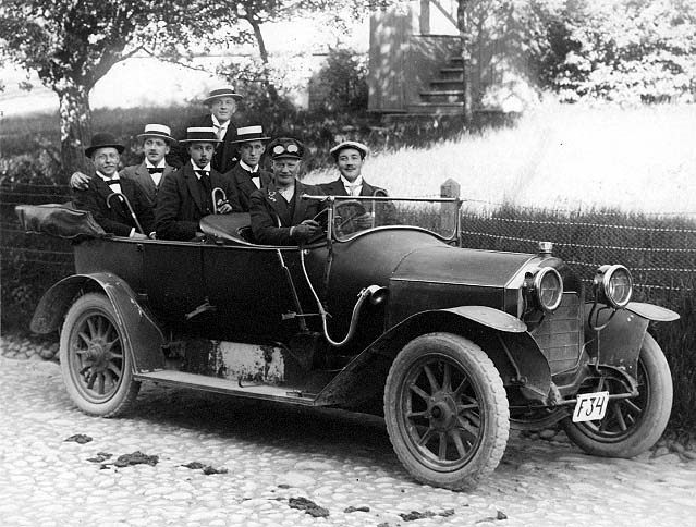 En bil (cabriolet) med registreringsskylt "F34" står på den kullerstensbelagda Brahegatan i Gränna. I bilen sitter det sex män och en sjunde står möjligen på fotsteget på andra sidan av bilen. De är glada. Någon av männen är troligen Emil Nilsson från Huskvarna.