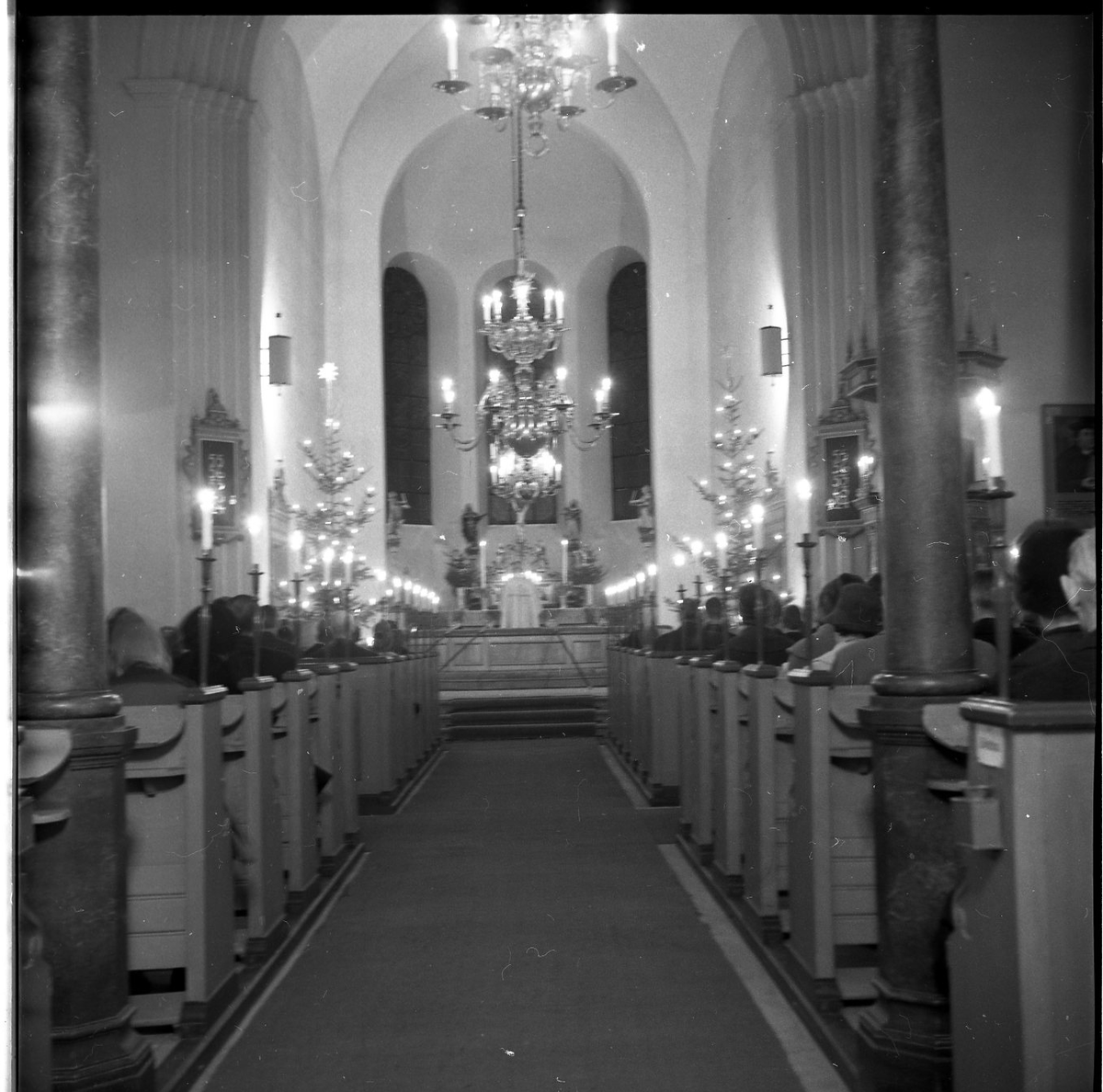 En altargång kantas av tända ljus. Bredvid altaret står två julgranar. I bänkarna siter människor