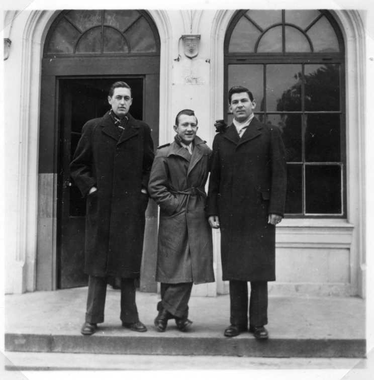 Tre män i rock står utanför en större okänd byggnad, troligen i Jönköping. Mannen till höger är möjligen kapten B R Baier och han i mitten är möjligen R T Golembiewski