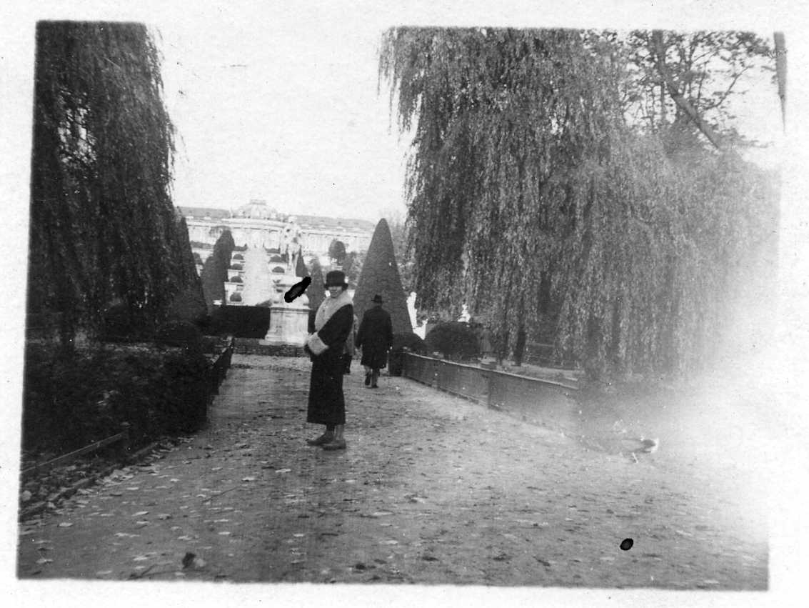 En kvinna i mörk kappa med päls på krage och ärm. Hon befinner sig i en park med en slottsliknande byggnad på en höjd i bakgrunden och med en ryttarstaty hitom densamma.
