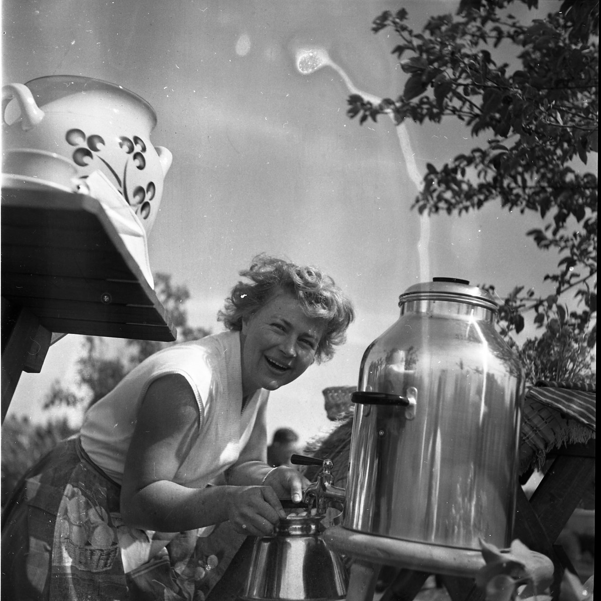 En kvinna står och tappar upp kaffe i en kaffepanna från en större termos. Hon ser glad ut.