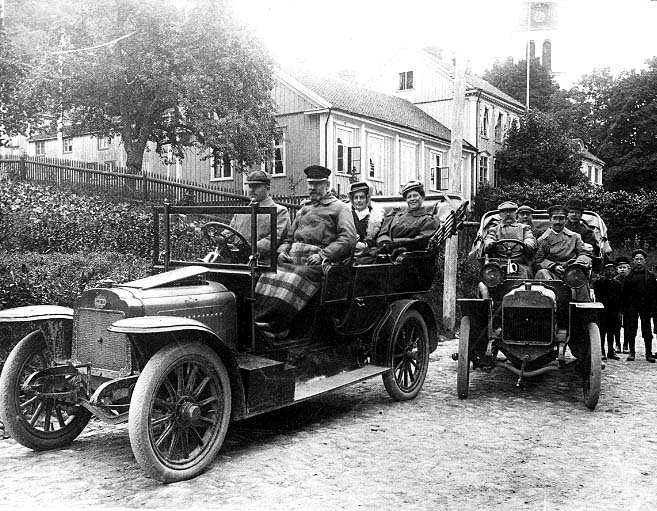 Två bilar (cabrioleter) står på den kullerstensbelagda Brahegatan i Gränna i riktning norrut. I den främre bilen sitter direktör Pedersen (Johannes Peterzén?) från Linköping bredvid chauffören. I baksätet sitter fru Pedersen till vänster och intill henne fru Karlsson. I den andra bilden sitter fyra män. Bakom ratten sitter Karl Gustav Karlsson från Skövde och intill honom Fritz Forsell. K G Karlsson var den förste i Skövde att äga bil.