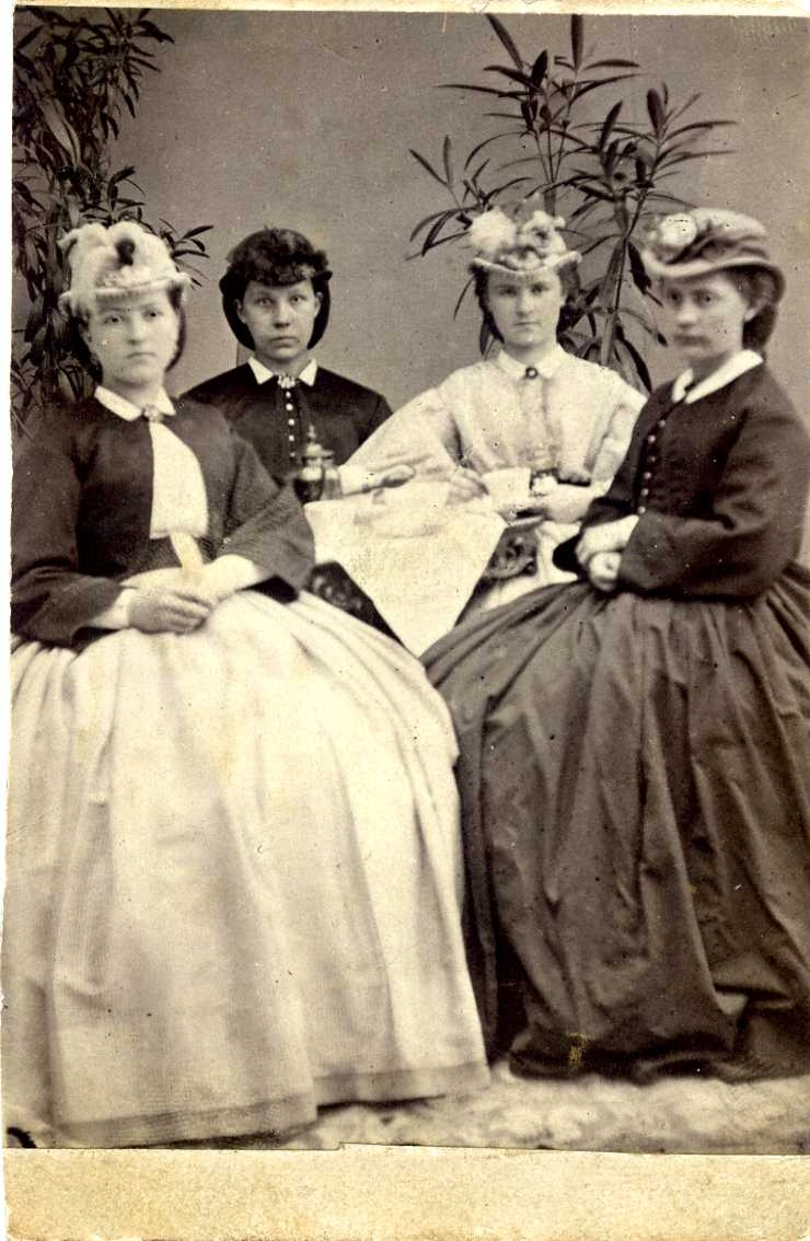 Fyra unga kvinnor med med hattar och vida kjolar sitter runt ett bord.