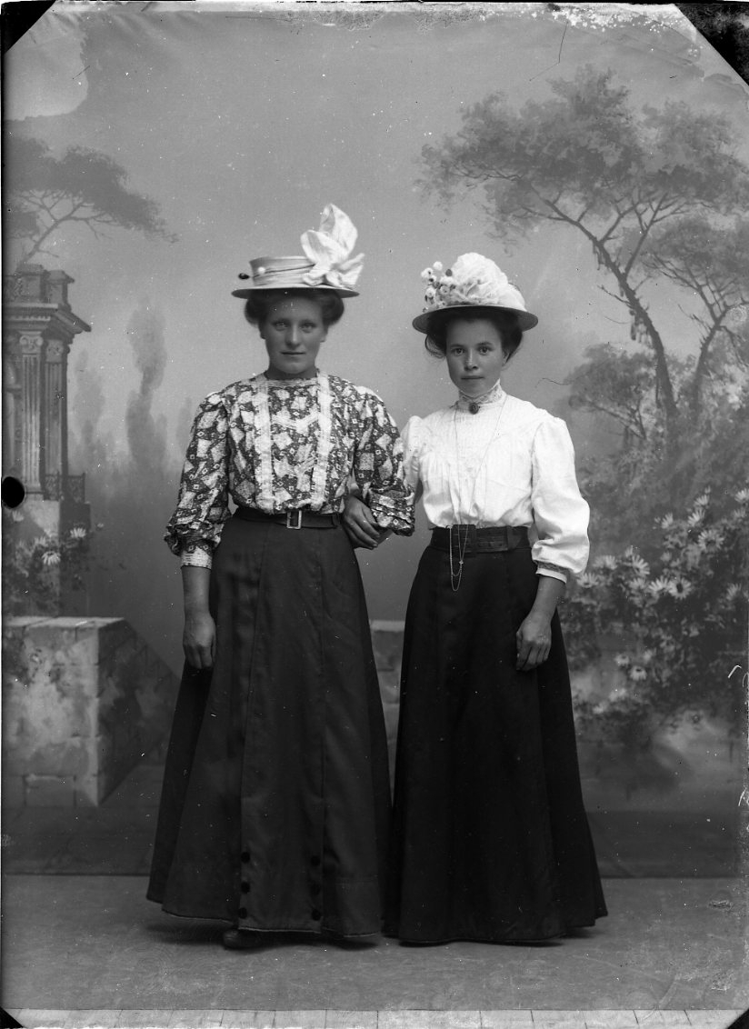 Porträtt av två unga kvinnor med stora hattar, de håller armkrok.