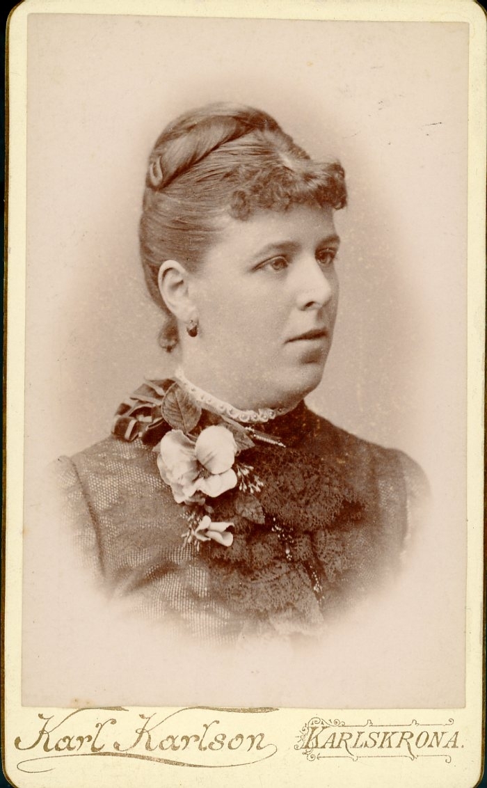 Kabinettsfotografi: "Aug. Claussen", bröstbild med blomsterbrosch vid halsen.