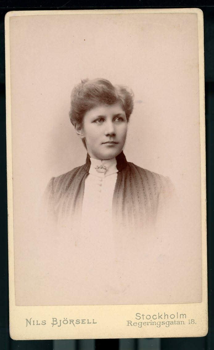 Kabinettsfotografi: bröstbild av Adélaide Stackelberg, brosch i halsen i form av krona. Gift med Hjalmar Westring.