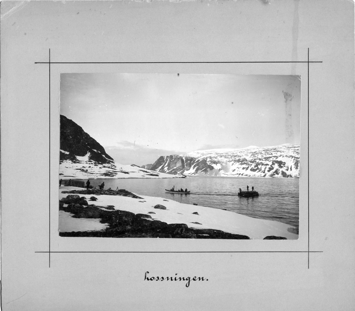 Lossning av virke till ballonghuset. Sannolikt Gösta Grönberg med gevär till vänster.