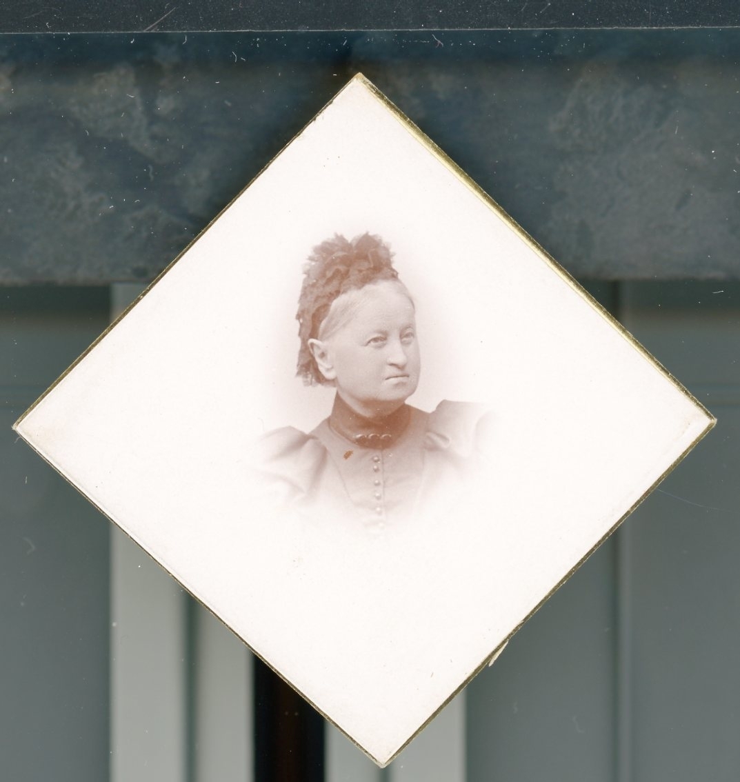 Kabinettsfotografi: Hilda Hjertström med huvudbonad.