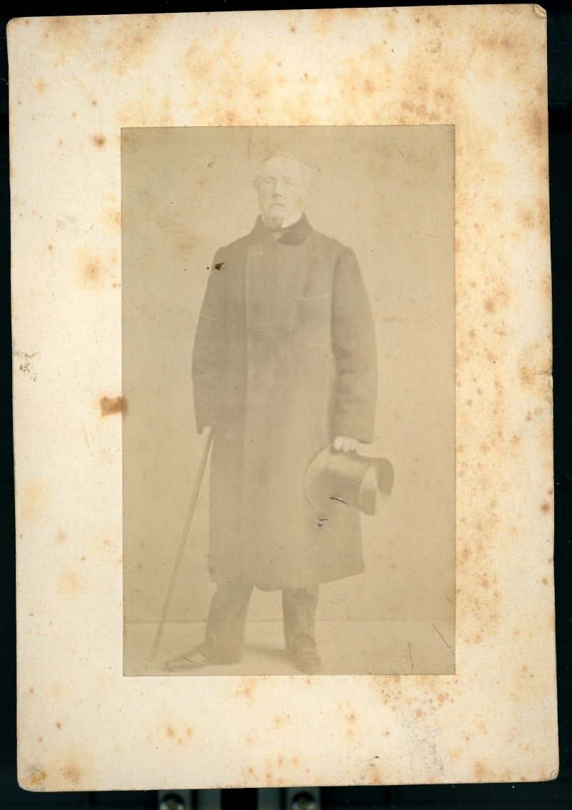 Fotografi av Nils Fredrik Hjertström i helfigur med rock, spatserkäpp och hög hatt i ena handen.