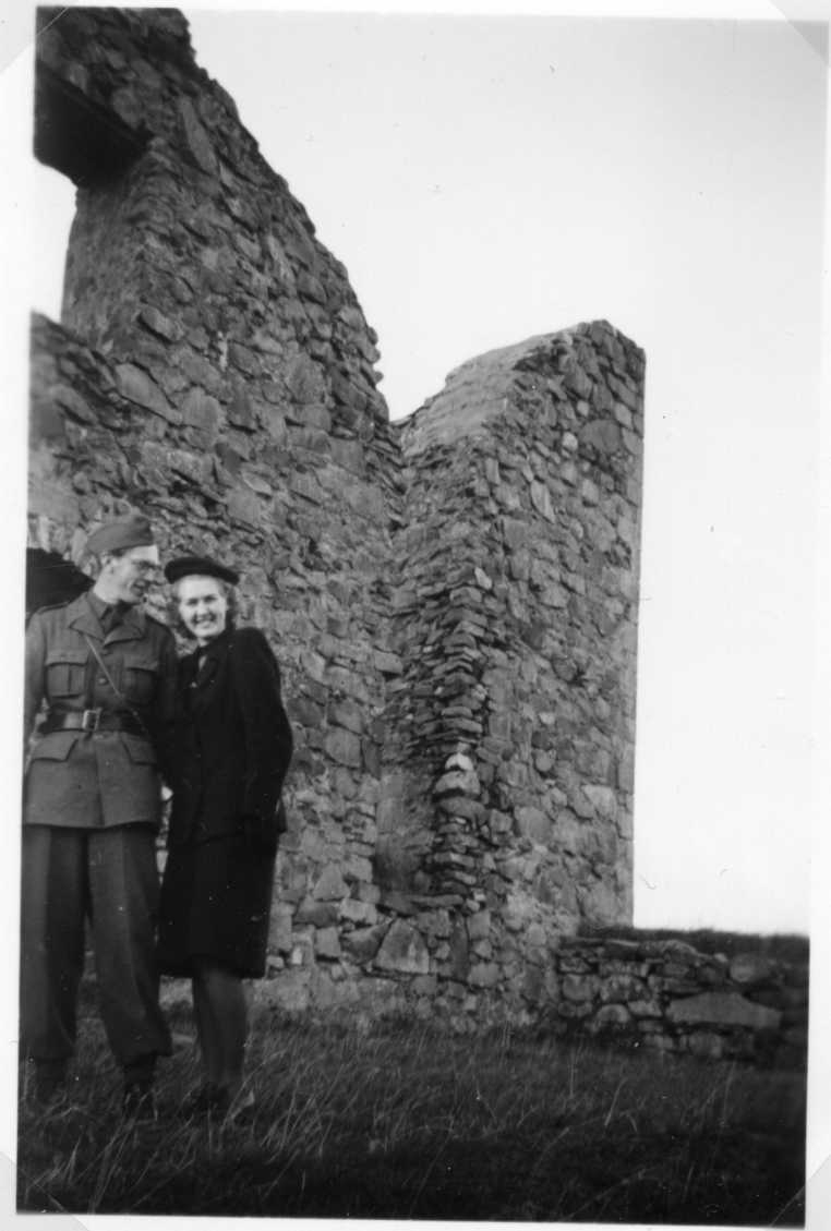 En man i militär uniform intill en kvinna i mörk dräkt vid Brahehus ruin.
