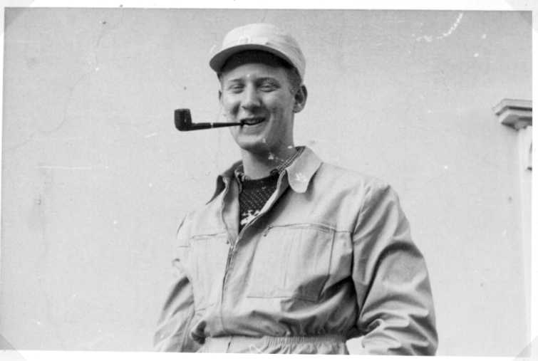 Ung man med skärmmösa och pipa i munnen.