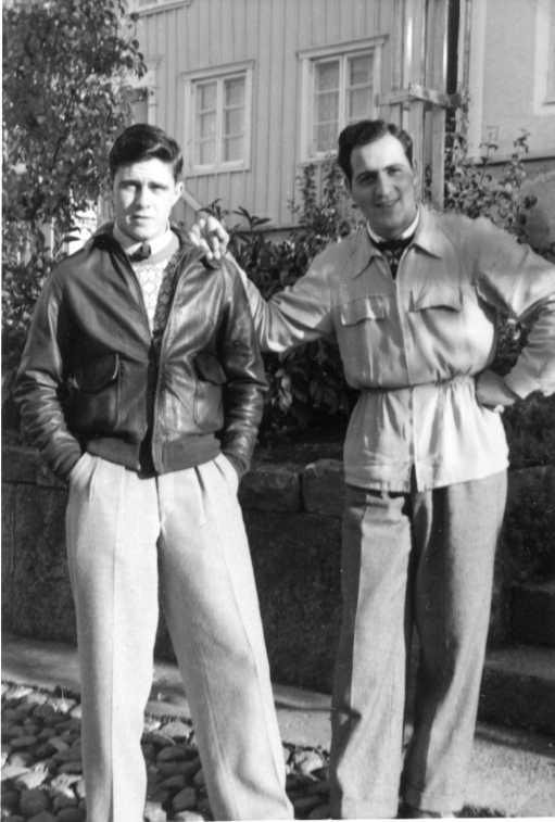 Två män. Den ena i skinnjacka och den andra i bomullsjacka med dragsko i midjan.