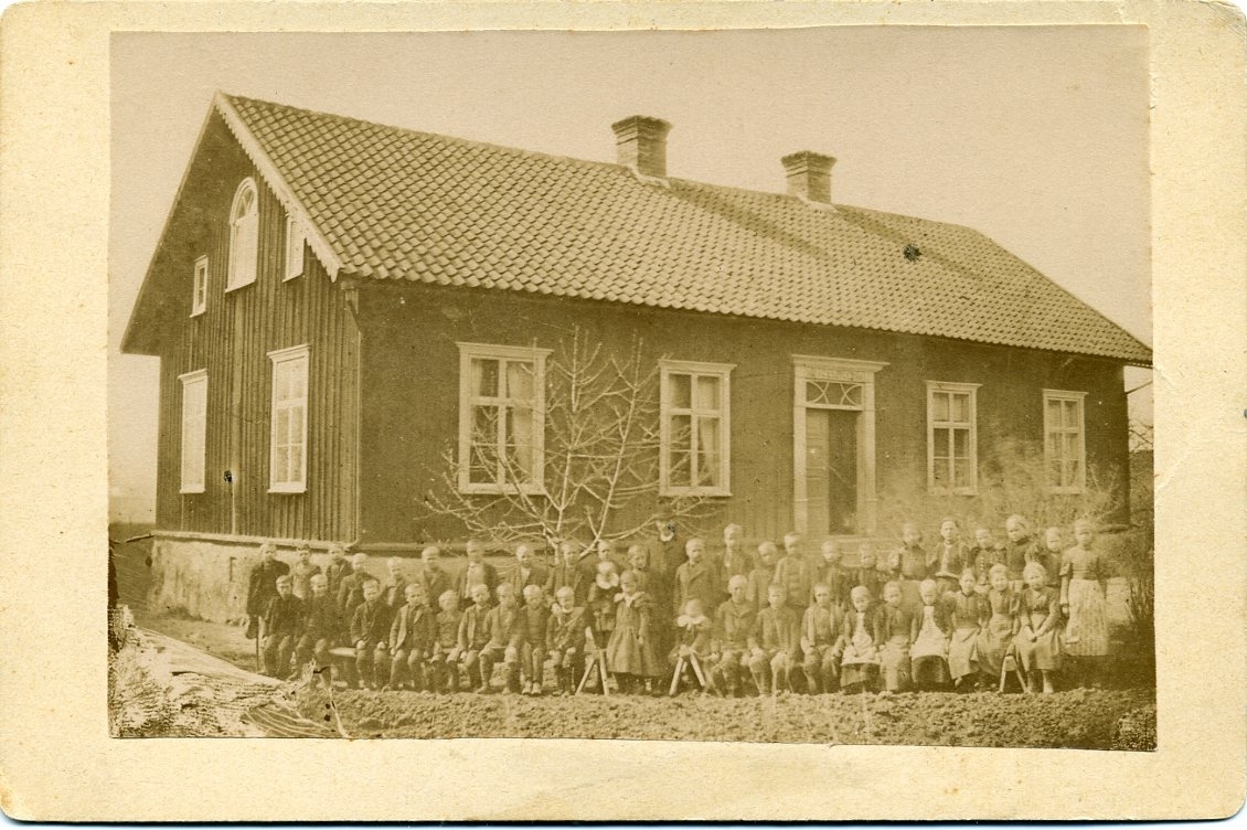 En skolklass sitter och står framför Uppgränna skola tillsammans med läraren J Mellin.
