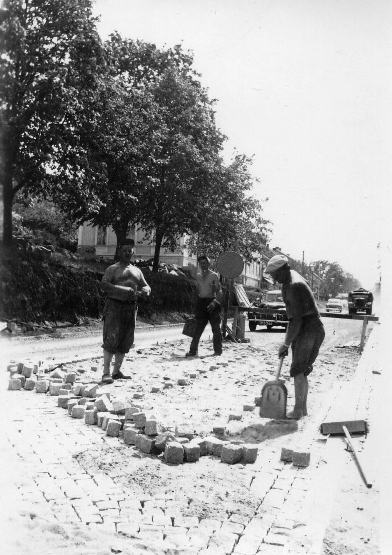 Vägarbete med stensättning av Brahegatan nedanför kyrkan.