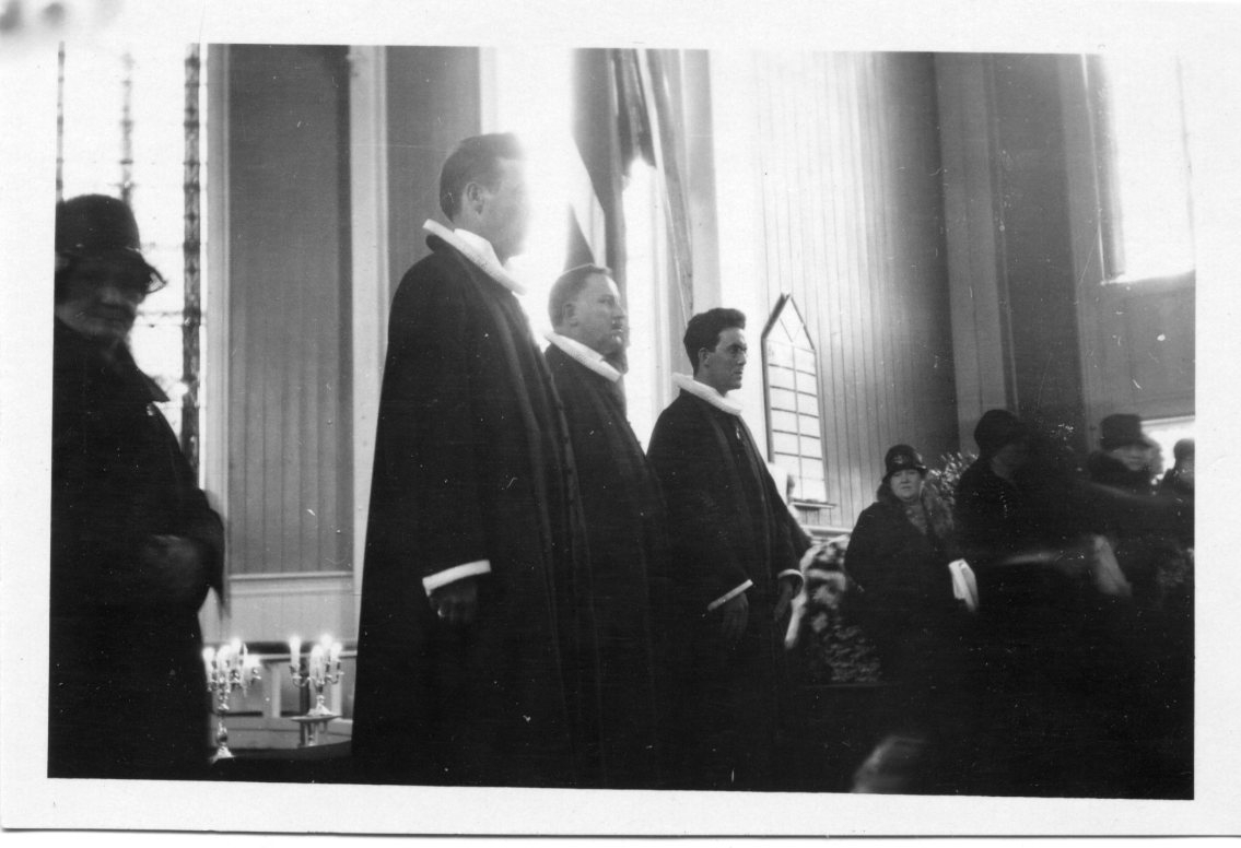 Gudstjänsten i Tromsö domkyrka. Domprost Nissen flankerad av prästmän.