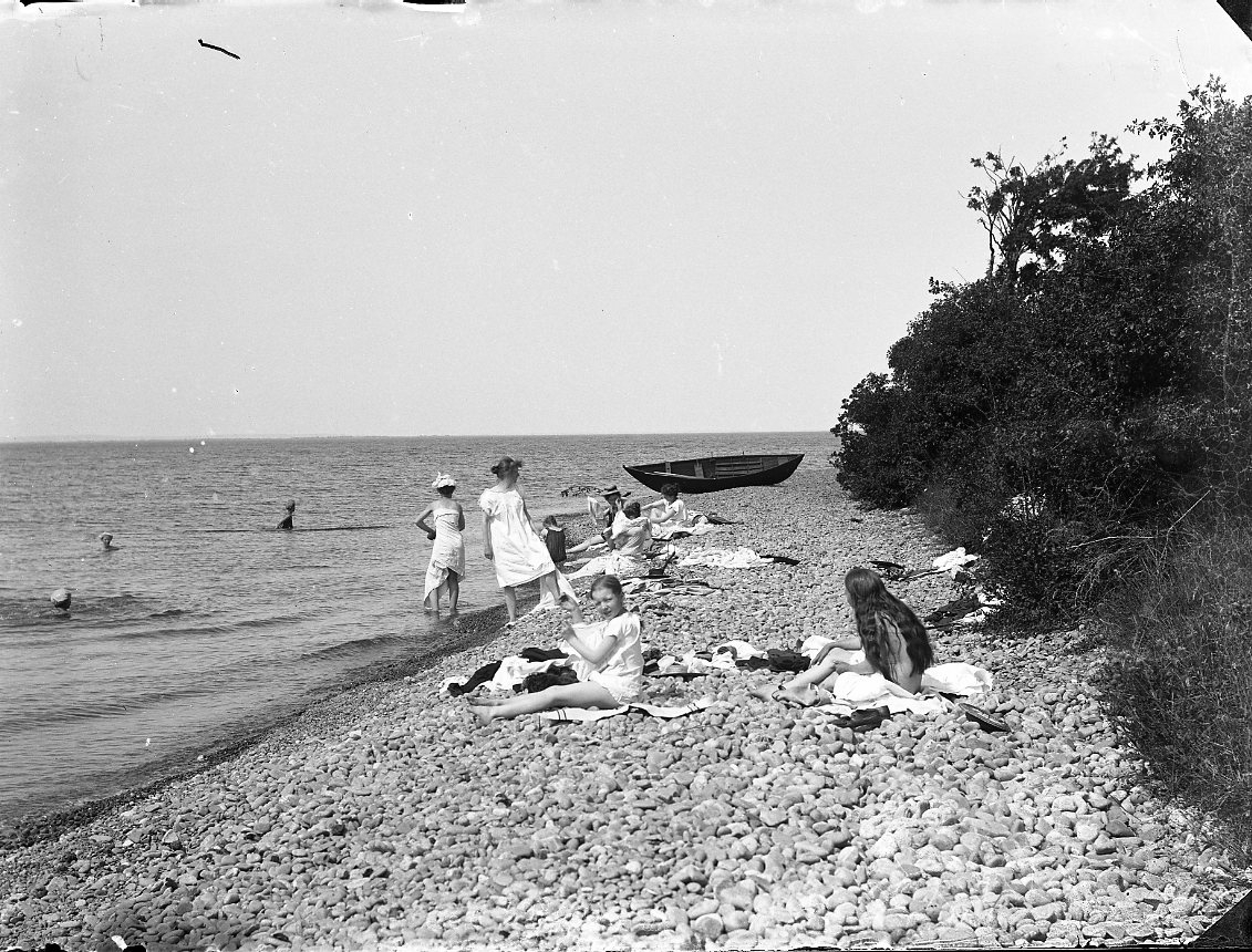 Badande flickor och kvinnor, troligen Vättern. En hund springer vid strandkanten och i bakgrunden ligger en eka uppdragen på den steniga stranden.