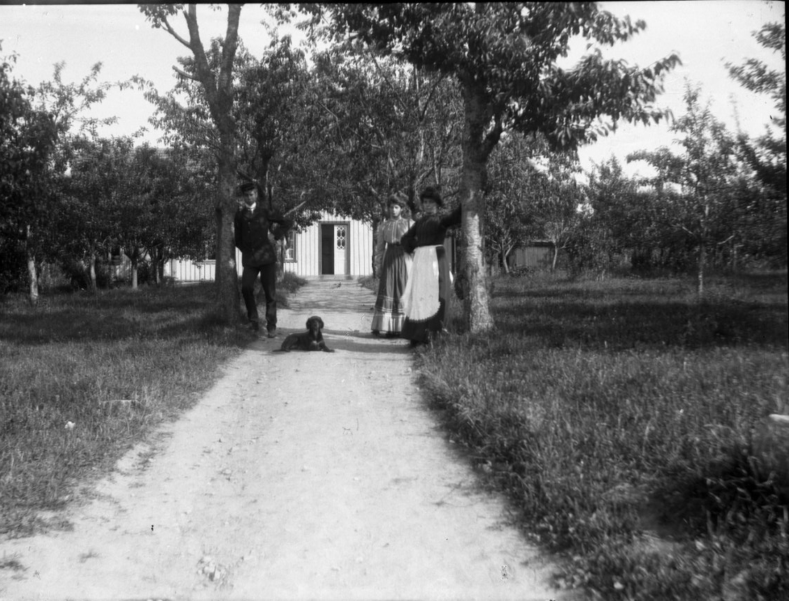 I en grusad allé fram till ett hus med öppen dörr står en yngling lutad mot ett träd. På andra sidan står två kvinnor på liknande sätt. En hund ligger på vägen.