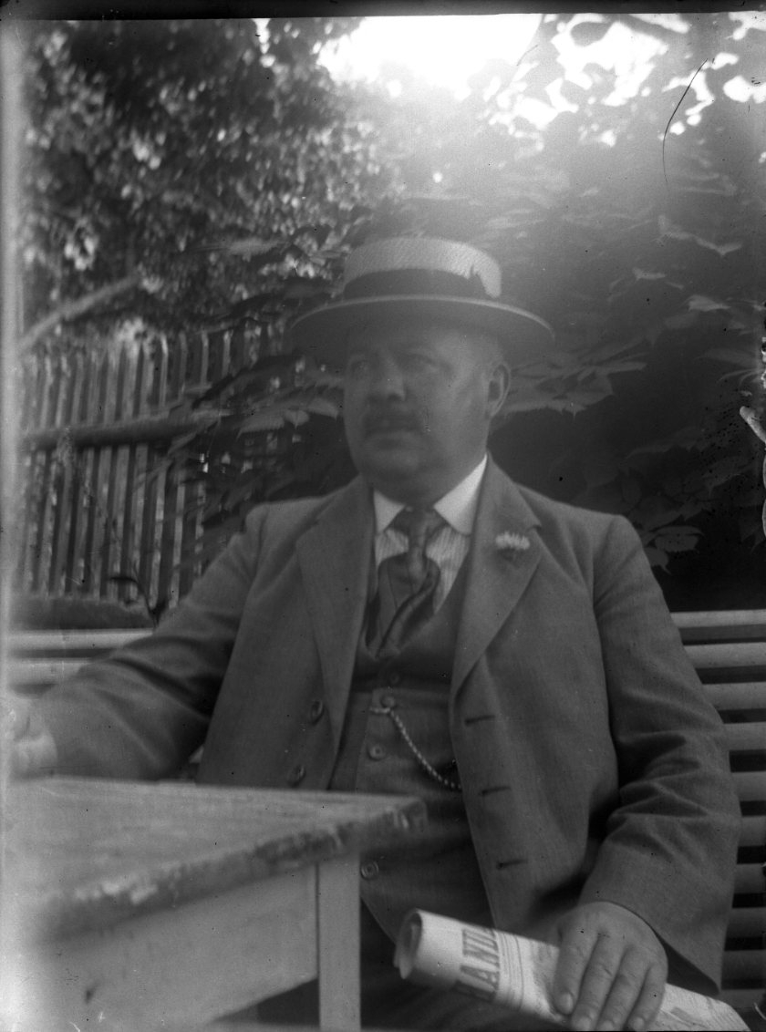 Porträtt av en okänd man med mustasch och hatt. Han sitter i en trädgårdssoffa och håller tidning i vänster hand - möjligen Smålands Allehanda.