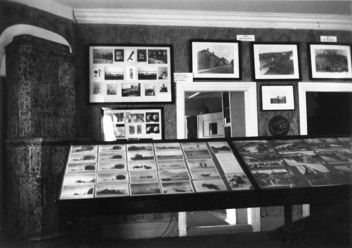Interiör från Andréemuseet i Franckska gården. Bland annat fotografier i montrar och på väggarna.