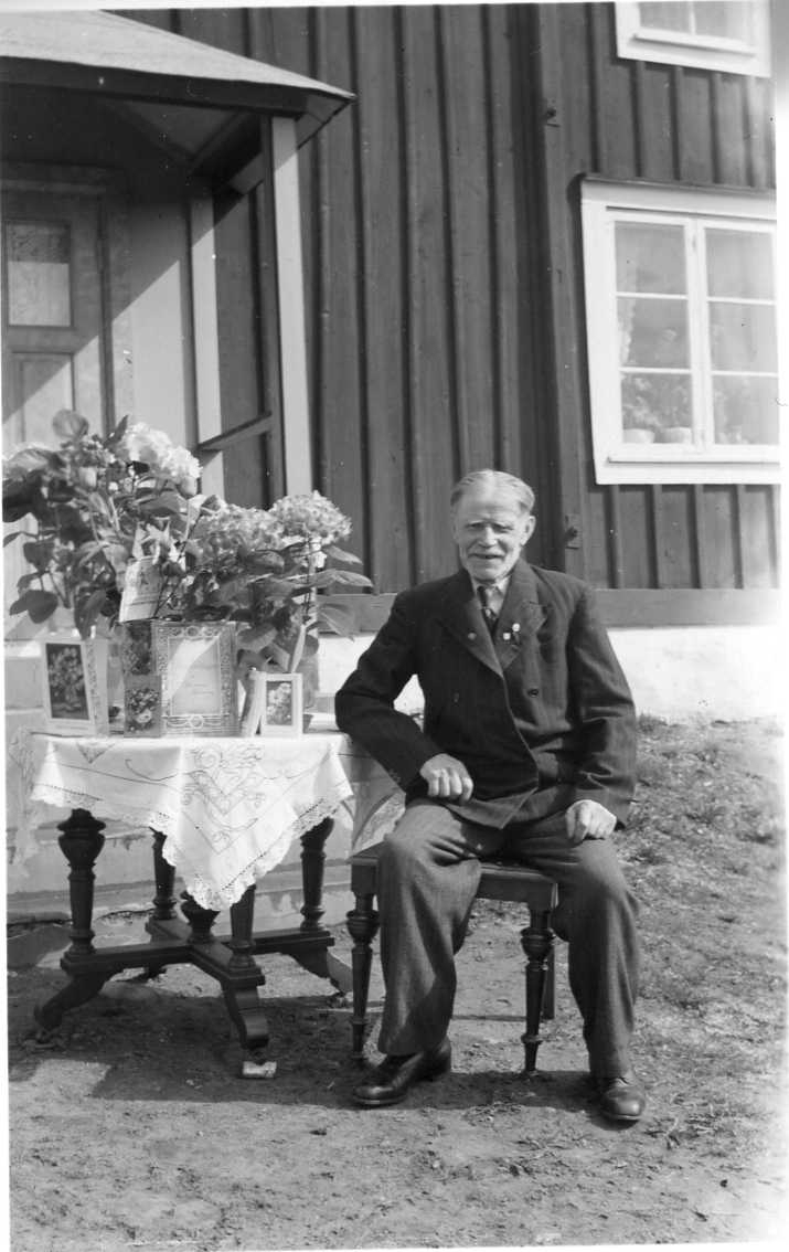 På en något jordig yta framför en farstu sitter en äldre man på en stol intill ett bord med blomsterbuketter och gratulationskort.