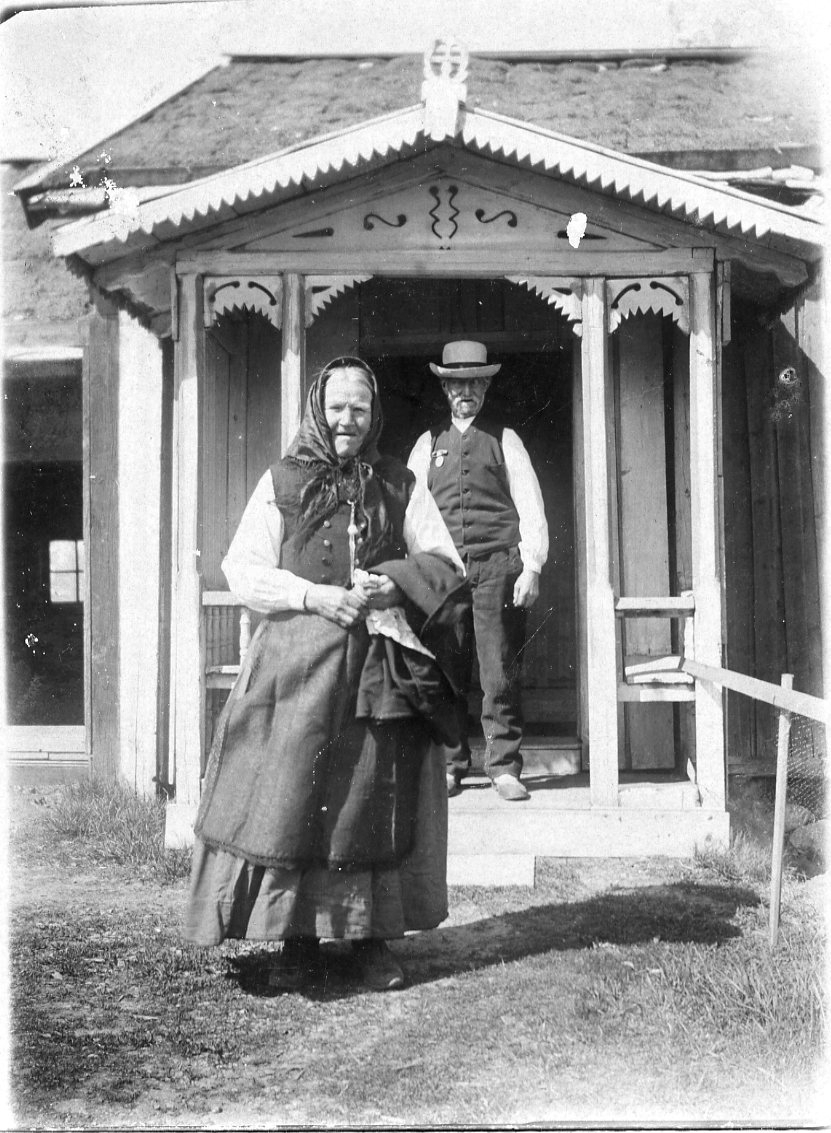 En äldre kvinna och man står vid en farstu med snickarglädje. Kvinnan har förkläde och sjalett. Mannen har hatt och en medalj på bröstet.