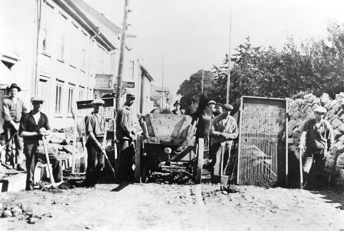 Män med skyfflar, korpar, såll och hästdragen flakvagn står på en uppriven gata. Till höger ligger en stor hög med storgatsten.