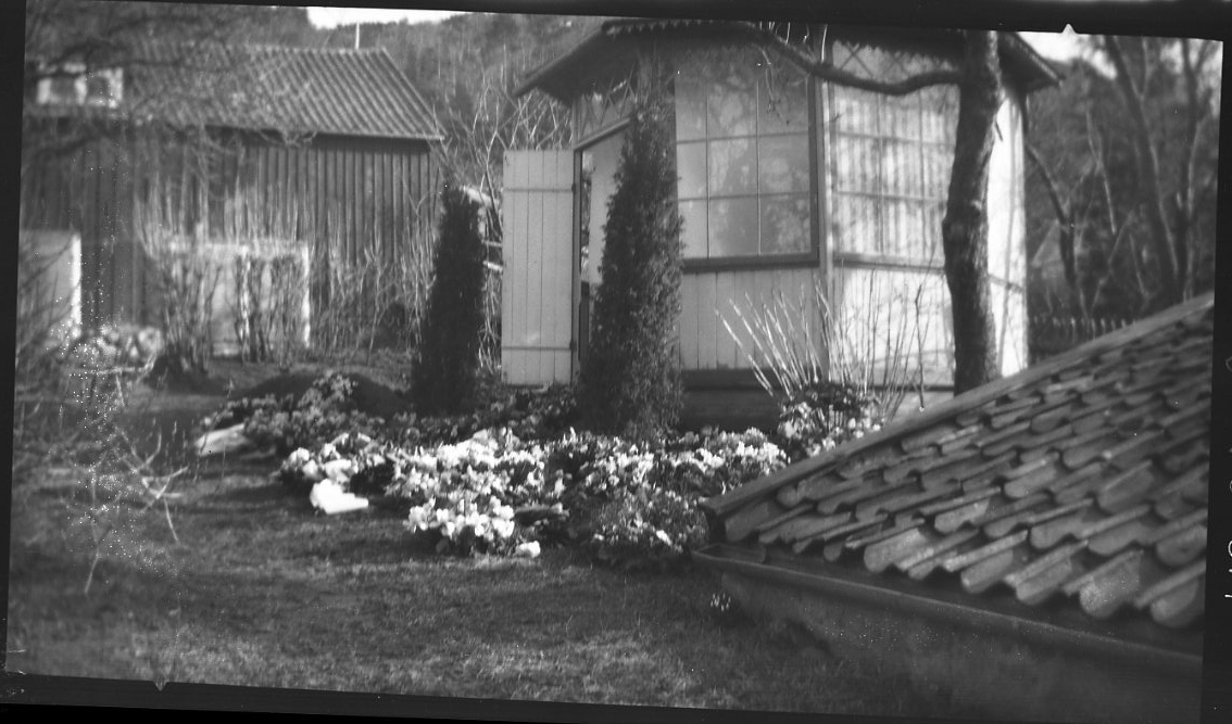 Titel: Kransband och blommor ligger utlagda på gräsmattan i en trädgård.