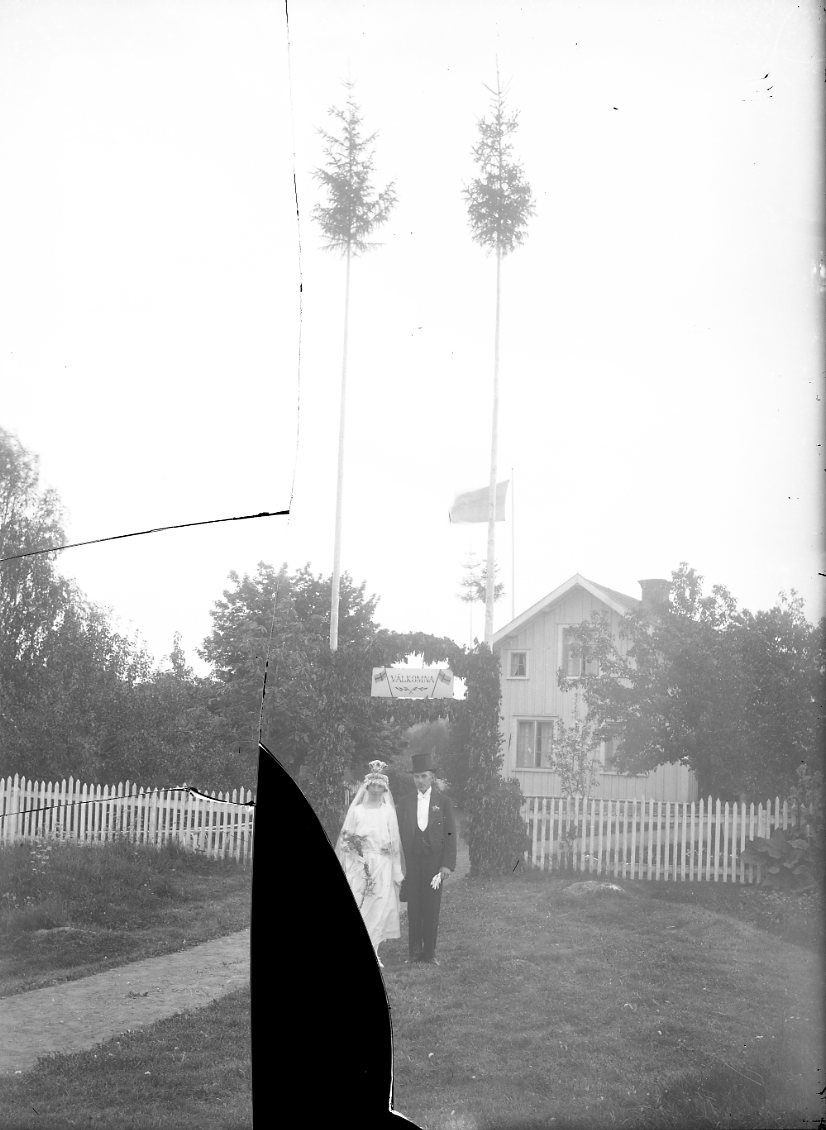 Ett okänt brudpar står framför ett staket till en trädgård med ett hus. En lövad båge med två höga störar med granar i toppen. Bruden i vitt, brudgum med hög hatt.