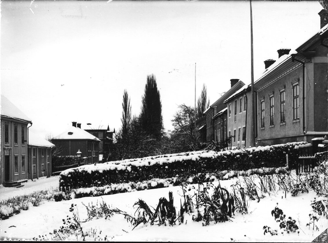 Stadsbild från Gränna vintertid. Förgårdar med snö, fotograferat mot norr.