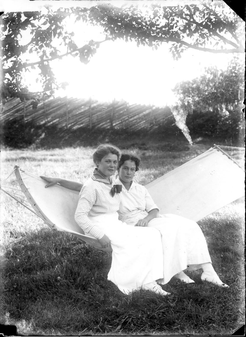 Två unga kvinnor sitter intill varandra i en hängmatta. En gärdesgård löper bakom dem. Det är sommar.