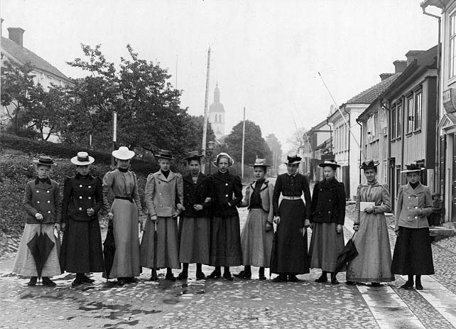 Elva unga kvinnor/flickor står på rad tvärsöver Brahegatan. De är vandringsturister. Fem av dem paraply. Det har regnat, det är lite vattenpölar på kullerstensgatan.