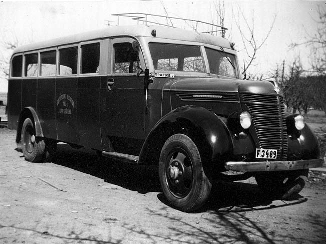 En buss av märket International årsmodell 1938 med registreringsnummer F3489. På sidan märkt "Gustafssons Bilstation Tel 1 Uppgränna".