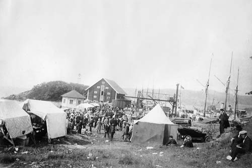 Marknadstält och folksamling i Hästholmen i samband med bärgning av ångbåten Per Brahe.