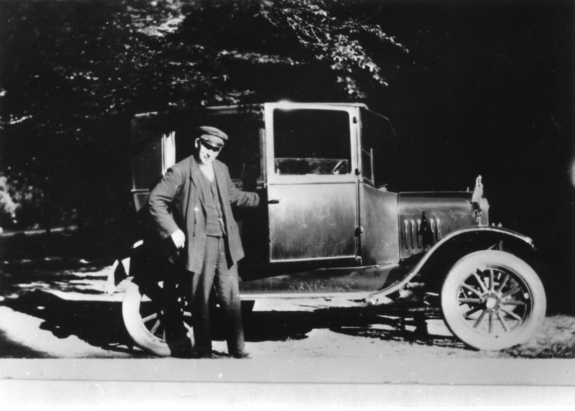 En man med keps står vid Uppgrännas första taxi, han har solen i ögonen.