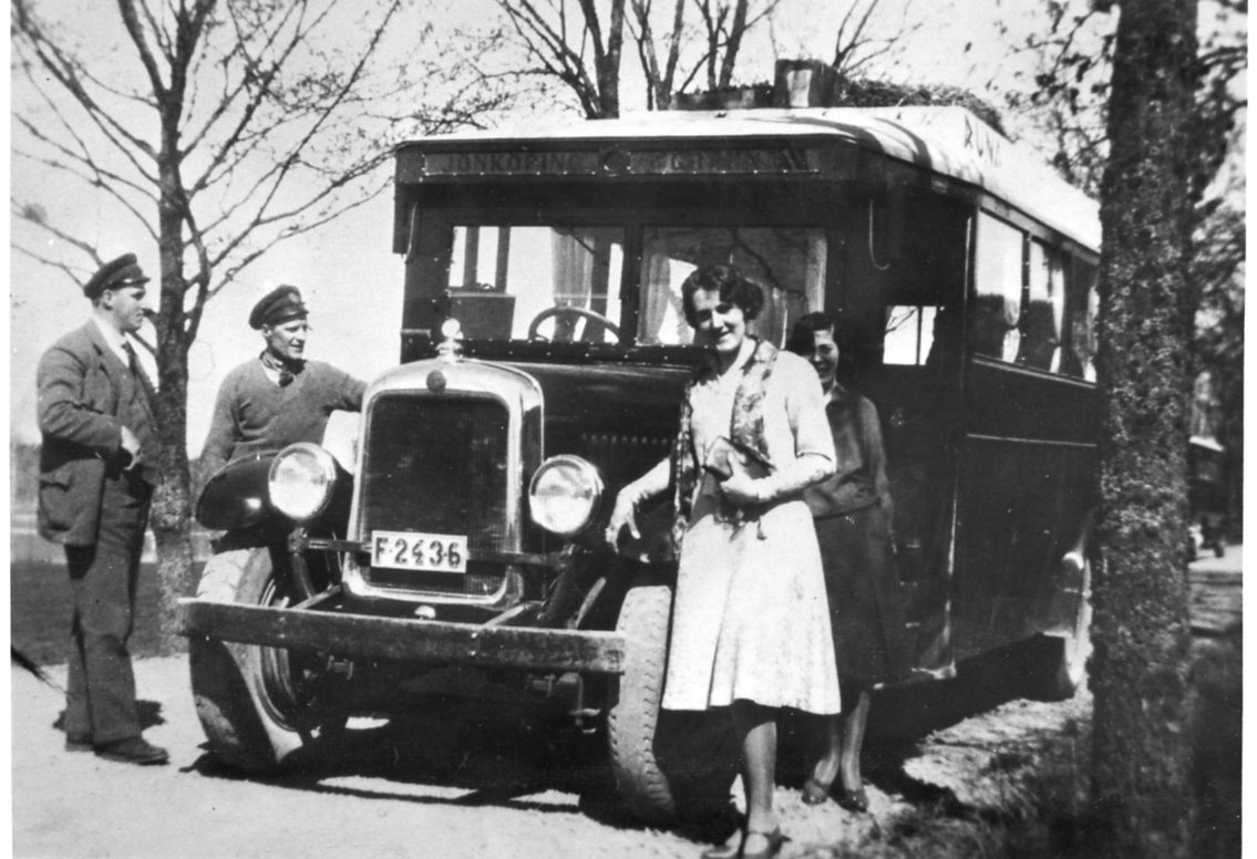 Två män och två kvinnor flankerar en buss med reg nr F2436. På skylten ovanför vindrutan står det "Jönköping Gränna". Bussen är av fabrikatet GMC.