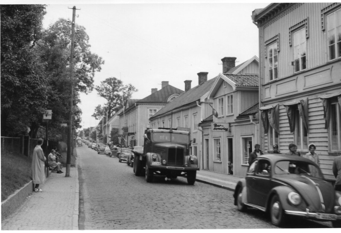 Tätt trafik rullar på Brahegatan norrut genom Gränna i samband med en solförmörkelse. En Volkswagen närmast i bild.
