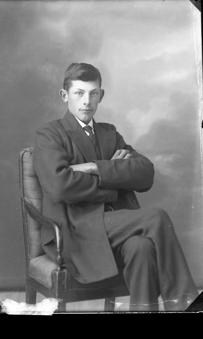 Porträtt av en pojke som sitter med armarna i kors i en fåtölj.