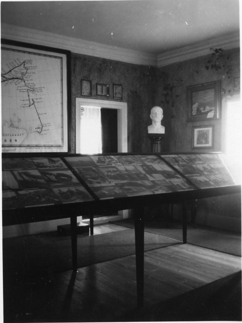 Interiör från Andréemuseet i Franckska gården. Bland annat karta över Andréexpeditionen rutt, fotografier i montrar och en byst.